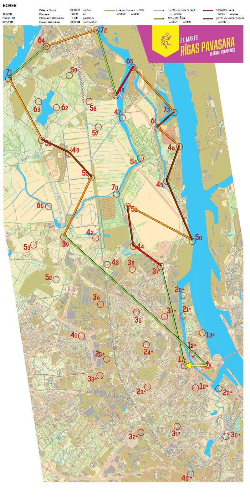 | Order No. | CP No. | Time | Points | Total points | Stage time | Total time | Stage distance | Total distance | min/km | min/pts | Split place |