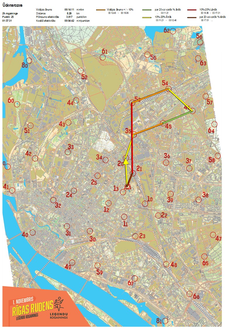 | Secības nr | KP nr | Laiks | Punkti | Kopējie punkti | Posma laiks | Kopējais laiks | Posma distance | Kopējā distance | min/km | min/pts | Vieta etapā |
